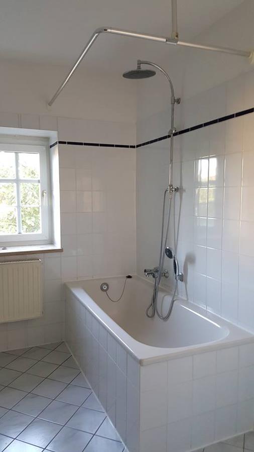 Das Bad ist mit Fenster, Badewanne und Waschmaschinenanschluss.